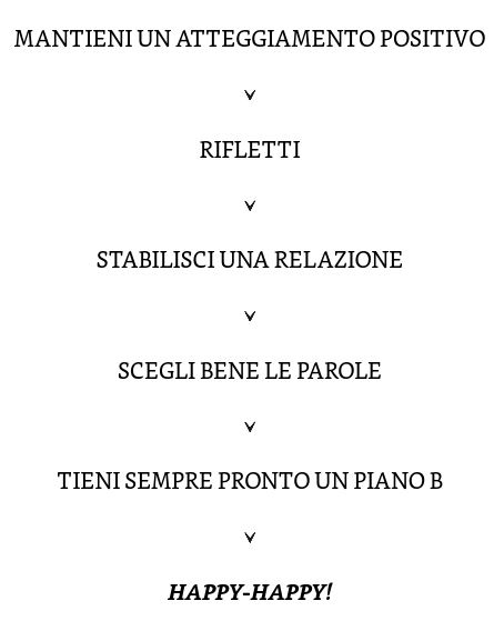 Innanzitutto Happy happy dà riscontro a precise esigenze personali e lavorative di questa fase della mia vita; certo, questo in sé non sarebbe un valido motivo per consigliarlo ad altri, giusto? Ma, riflettendo, ho pensato che conoscere questo metodo di negoziazione mi sarebbe servito anche in passato, e probabilmente anche in altre situazioni. Inoltre mi sarebbe stato utile che anche i miei interlocutori avessero conoscenza di certe dinamiche. Quindi, ho pensato, forse non si tratta solo di un’esigenza personale e circoscritta, ma è probabile che anche altri, in diversi contesti, avvertano le stesse difficoltà.